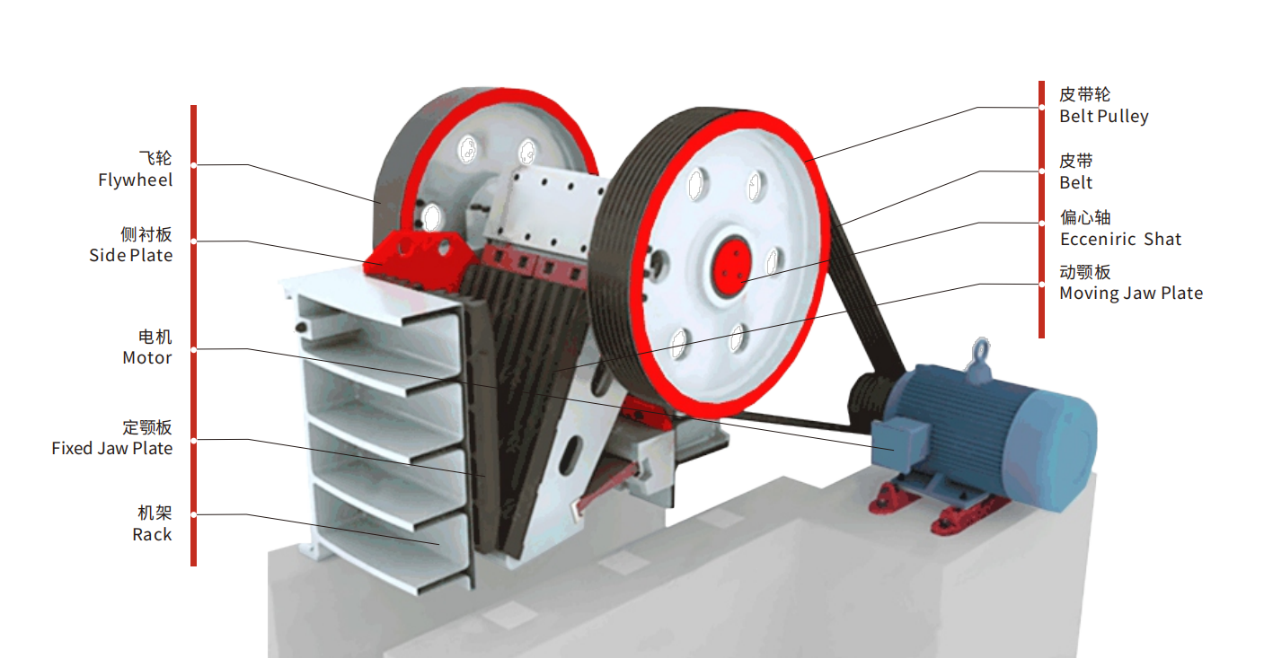 PE Jaw crusher is a kind of stone crusher which is widely used as primary and secondary crushing equipment to crush material with compression resistance less than 320MPa. Working principle is to use mechanical pressure between fixed jaw plate and movable jaw plate. force for breaking material. These two manganese jaw plate create a V-shaped cavity called the crushing chamber.